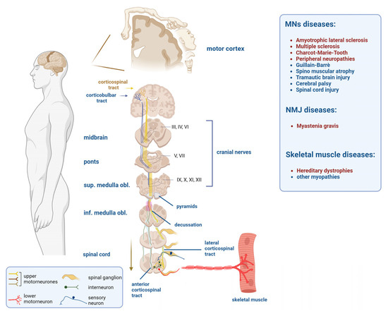 Neuromuscular diseases (NMDs) are a diverse group of adult and pediatric disorders that affect approximately 15 million people worldwide. These diseases are caused by inherited or spontaneous mutations in over 500 autosomal or X-linked genes that encode components of the motor pathway, also known as the pyramidal tract. This pathway anatomically consists of the corticospinal and corticobulbar tracts [1]. The corticospinal tract is one of the most important descending tracts of the central nervous system (CNS). It is the pathway through which upper motor neurons (UMNs) originating from the motor and somatosensory cortex send their axons via the cerebral peduncle into the brainstem and anterior medulla oblongata. At this level, the majority of axons cross from one side to the other within structures called pyramids. Technically, this anatomical twist of somatic descending fibers is called decussation. The axons that decussate (approximately 80%) form the lateral corticospinal tract, with the remaining ones forming the anterior corticospinal tract (Figure 1). Once the UMN axons reach the spinal cord, they form synapses with lower motor neurons (LMNs) to innervate skeletal muscles, although the majority of synapses occur first with an interneuron in the anterior grey column [2] (Figure 1). The corticobulbar tract is instead formed by UMNs originating from the ventral motor cortex and terminates in the midbrain, pons, or medulla oblongata without passing through the pyramids (Figure 1). The somatic fibers within the corticobulbar tract are essential for transmitting motor signals to the cranial nerves that supply muscles of the head, neck, and face [3] (Figure 1).