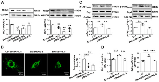 2.2. Silencing MiD49 or MiD51 Inhibited Mitochondrial Fission, Cell Adhesion and Proliferation by Inhibiting Drp1 and Related Proteins