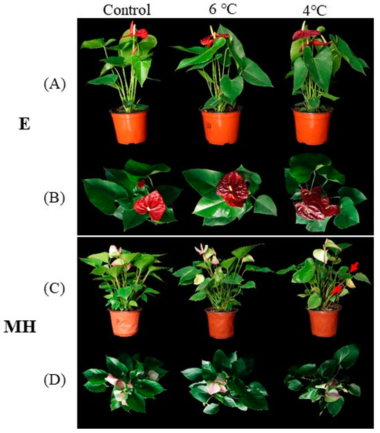 Phenotypic responses of E and MH to cold stress. Images of E and MH grown at 25/22 °C (control) then kept under the same conditions or transferred to 6 °C or 4 °C for 3 days. (A,C) Side views of the plants and (B,D) top views of the plants. The red arrow indicates the softened petiole of MH.