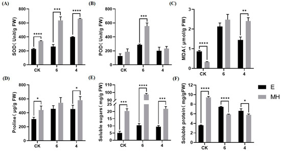 Differential physiological responses of E and MH to cold stress. (A) Superoxide dismutase (SOD) activity, (B) peroxidase (POD) activity, and the contents of (C) malondialdehyde (MDA), (D) proline, (E) soluble sugar, and (F) soluble protein. Error bars represent SD (n = 3). The statistical significance was determined by multiple t-tests. p < 0.05, *; p < 0.01, **; p < 0.001, ***; p < 0.0001, ****.