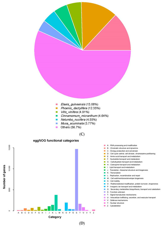 Overview of RNA sequencing results and annotation of unigenes. (A) Distribution of unigenes. (B) Overlap between the number of all unigenes according to six databases. (C) Distribution of unigene annotations based on the Nr database for the species distribution statistics. (D) eggNOG functional classification of all unigenes.