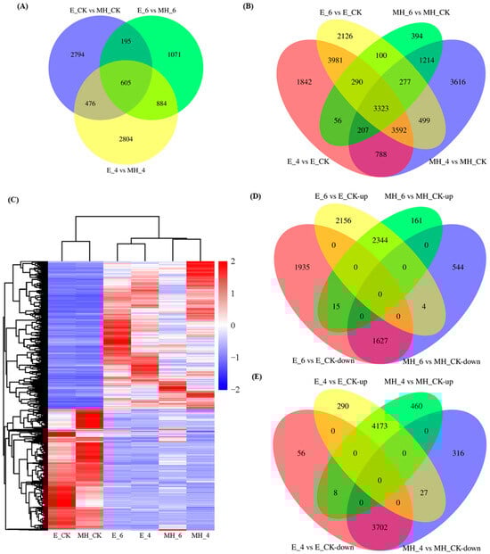 DEGs of two cultivars in response to cold stress. (A) Venn diagram showing DEGs’ profile between E and MH under different cold treatments. (B) Venn diagram showing the overlap in DEGs in both cultivars between cold and control conditions. (C–E) The 9132 common DEGs differentially expressed in both cultivars during cold stress. (C) Heatmap showing the results of clustering analysis of the 9132 common CSR DEGs. (D) Venn diagram showing the overlap in DEGs expressed after 6 °C cold stress in both cultivars. (E) Venn diagram showing the overlap in DEGs expressed under 4 °C cold stress in both cultivars.