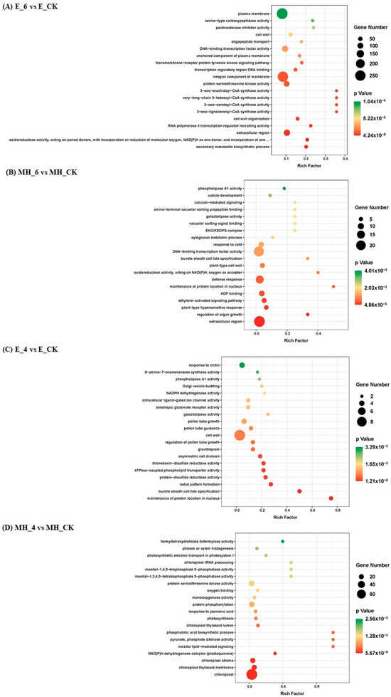 Gene expression differences in both cultivars between control vs. cold (6 °C and 4 °C treatments) were calculated. A total of 22,305 DEGs were obtained from comparisons 6 °C versus CK and 4 °C versus CK for both cultivars: 14,188 (8616 up and 5572 down) and 5861 (3203 up and 2658 down) DEGs were identified between 6 °C and CK for E and MH, respectively, and 14,079 (8166 up and 5913 down) and 13,516 (6880 up and 6636 down) DEGs were identified between 4 °C and CK for E and MH, respectively (Figure 4B and Figure S3B, Table S4). There were more upregulated genes than downregulated genes in all comparisons (Figure S3B). At 6 °C, there were more DEGs in the cold-tolerant cultivar E than in the cold-sensitive cultivar MH (Figure S3B), which indicated that more genes show changes in expression to response to cold in E than in MH in the early stage of cold stress.