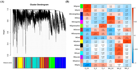 Weighted gene co-expression network analysis (WGCNA) is a systems biology method for describing the correlations among genes across samples [47]. WGCNA is used to not only construct gene networks but also detect gene modules and identify the central players (i.e., hub genes) within modules. To comprehensively decipher the mechanism of cold response in Anthurium, all DEGs (24,695) were used to build a gene co-expression network. Via sample clustering, 18 samples were included in the analysis. Based on pairwise correlations of gene expression, 16 modules were identified (marked with different colors in Figure 6A). A correlation heatmap of module-cold relationships was constructed to clearly visualize the correlation of modules and cold treatment (Figure 6B). The turquoise module was associated with the E_6 (R = 0.76, p = 3 × 10−4), and the greenyellow module was associated with E_4 (R = 0.79, p = 8 × 10−5). Importantly, these two modules were negatively associated with the MH samples. The tan and yellow modules were tightly associated with MH_6 (R = 0.83, p = 2 × 10−5) and MH_4 (R = 0.89, p = 1 × 10−6), respectively, and both modules were negatively correlated with the E samples.