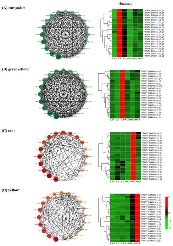 Identification of hub genes of the four key modules responsive to cold stress in Anthurium. The co-expression network of the top 20 hub genes of the key modules was visualized by Cytoscape. The heatmaps show the expression of the top genes of the four modules. (A) The turquoise module. (B) The greenyellow module. (C) The tan module. (D) The yellow module. The hub genes with the highest connectivity to other genes are shown in the nodes. The node colors corresponds to connectivity values, and their sizes represent the module membership value calculated by WGCNA. The darker and larger the node, the greater the hubness of the gene. The width of the lines between nodes corresponds to weight as calculated by WGCNA. The wider the line, the higher the weight value between the nodes. The values in the heatmap represent the z-score of the transcript levels in different samples. Red indicates a high expression level, while green is low.