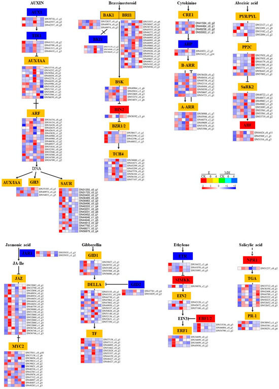The expression patterns of DEGs in the “plant hormones signal transduction” pathway. Heatmap shows the expression of DEGs associated with different hormones in E and MH. In the pathways, blue indicates the downregulated genes, orange indicates down- and upregulated DEGs, and red indicates the upregulated genes. Mean TPM values of the three replicates were used to represent gene expression value in the heatmap.