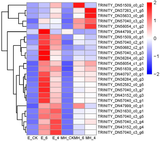 The RNA quality was checked by electrophoresis and the concentration was calculated according to the optical density (OD) at 260 nm and 280 nm using a Nanodrop 2000 (NanoDrop, Wilmington, DE, USA). The first-strand cDNA was reverse transcribed from 1 μg of the total RNA using the Evo M-MLVRT Kit (cat no. AG11711, Accurate Biology, Changsha, China). qRT-PCR was performed using the SYBR® Green Premix ProTaq HS qPCR Kit (cat no. AG11718, Accurate Biology, Changsha, China) on the Roche LightCycle96 Real Time System (Roche, Switzerland). The total volume for each reaction was 10 μL, comprising 0.4 μL specific primers, 1 μL cDNA, 5 μL SYBR mixture, and 3.6 μL double-distilled H2O. The cycling program was as follows: 10 min at 95 °C, followed by denaturation at 95 °C for 15 s, annealing, and elongation at 60 °C for 30 s (40 cycles). Gene-specific primers were designed by Primer Premier 5.0 software (Table S11). The actin gene was used as an internal reference gene. The qRT-PCR expression analysis for each gene was performed using three technical replicates (with three biological replicates). The relative expression levels of genes were calculated using the 2−ΔΔCT method [91]. The expression level of CK for E was used as a control; its value was set to 1. The relative expression levels of other samples (including the CK for MH) were determined relative to the control. In this way, we can compare the same gene across all samples of the two cultivars.