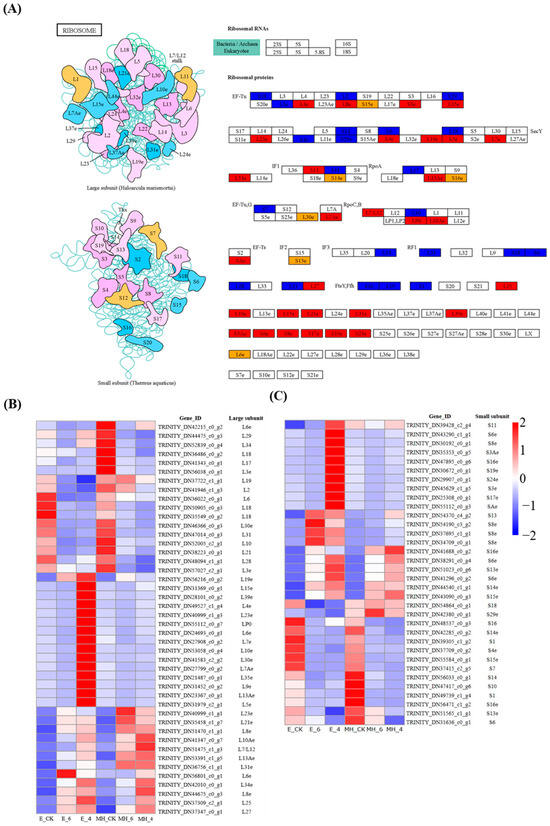 The expression patterns of DEGs encoding ribosome proteins (map03010). (A) The ribosomal DEGs. Blue indicates down-regulated genes, orange indicates down- and upregulated DEGs, and red indicates upregulated genes. (B) Heatmap of DEGs encoding large-subunit ribosomal proteins. (C) Heatmap of DEGs encoding small-subunit ribosomal proteins. In the heatmap, mean TPM values of the three samples were used to represent the gene expression value.