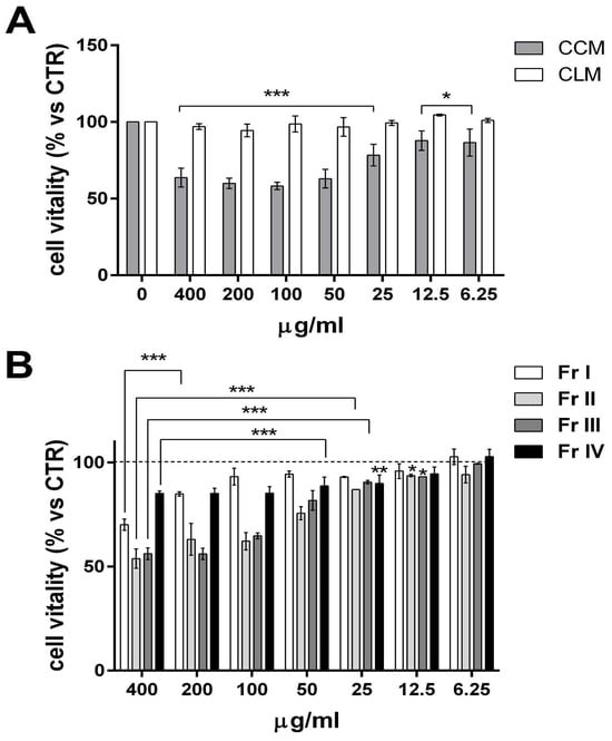 CCM whole extract and its isolated fractions II and III affect AGS cell vitality. (A) Histogram showing the viability of AGS cells, expressed as a percentage versus the control condition (dashed line, 100%), treated with a range of concentrations of CCM and CLM extracts (6.25–400 μg/mL) for 24 h by means of an MTT assay. (B) Histogram showing the viability of AGS cells treated with the same range of concentrations of CCM fractions I–IV (6.25–400 μg/mL) for 24 h. Results are expressed as means ± SD of 3 independent experiments performed in technical replicates. (ANOVA; * p < 0.05, and *** p < 0.001).