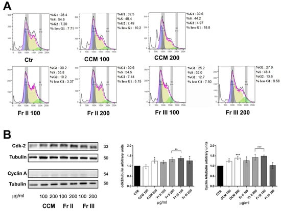 Figure showing that CCM extract and active fractions II and III affect the cell cycle inducing cdk2 and cycA expression. (A) Histograms of exponentially growing AGS cells treated with two selected concentrations (100 and 200 μg/mL) of CCM extract and fractions II and III for 24 h. Harvested cells were stained with propidium iodide (PI) and subjected to flow cytometry analysis. The histograms report the cell cycle distribution from univariate modeling via FlowJo software analysis (magenta line). The percentage of the cells in each phase of the cell cycle (G1 = blue peak; S = yellow peak; G2 = green peak) along with the percentage of sub-G1 events is reported on the right of each graph. A representative experiment out of three with overlapping results is shown. (B) Immunoblot of AGS cells treated as above with CCM and fractions II and III at the indicated concentrations.. For each blot stripped and reprobed with the different antibodies shown, tubulin was used as a loading control. The blots are representative of 3 independent experiments with similar results. The histograms on the right show the quantitative analysis in arbitrary units expressed as means ± SD of the results from the 3 independent experiments. (ANOVA; * p < 0.05, ** p < 0.01, and *** p < 0.001 vs. control).
