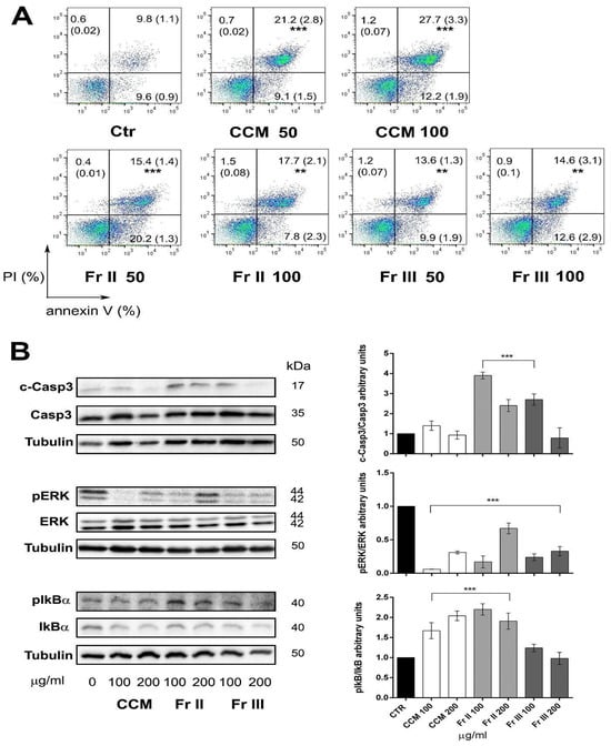 Figure showing that CCM extract and active fractions II and III induce AGS cells apoptosis. (A) Pseudocolor density plots showing quantitative analysis of Annexin V-positive (early apoptotic, lower right quadrant), PI-positive (necrotic, upper left quadrant) and Annexin-PI-double-positive (late apoptotic, upper right quadrant) cells (increased cell density from blue to green). The experiment shown is representative of 3 independent experiments that were carried out in duplicate. The mean percentages with SD in parentheses are expressed on each dot blot along with significance. (B) Figure showing immunoblot of AGS cells treated for 24 h with CCM and Fr II and III at the indicated doses. Tubulin was used as loading control for each immunoblot that was stripped and reprobed with the different total and phosphorylated antibodies. The blots in the picture are representative of 3 independent experiments with similar results. The histograms on the right show the quantitative analysis in arbitrary units expressed as means ± SD of the results from the 3 independent experiments. (ANOVA; ** p < 0.01, and *** p < 0.001 vs. control).