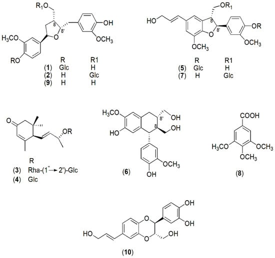 (+)-lariciresinol-9-O-β-d-glucopyranoside (2). NMR and optical rotation data were consistent with those previously reported [53]. ESI-MS (negative mode), m/z 521.0 [M − H]−.