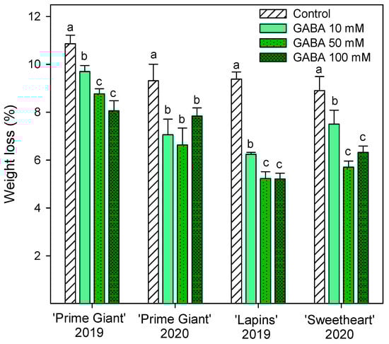 Weight loss of sweet cherries from control and γ-aminobutyric acid (GABA)-treated trees after 28 days of storage at 2 °C. Data are the mean ± SE of three replicates. Different letters show significant differences (p < 0.05) among treatments for each cultivar and growing cycle.