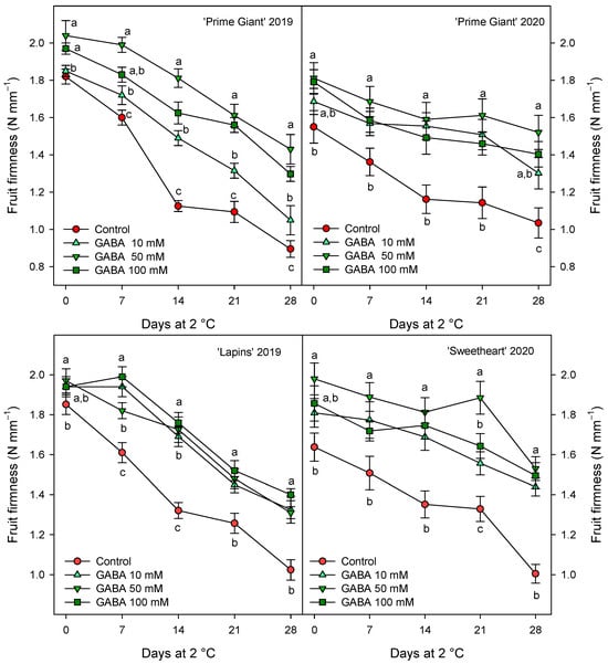 Fruit firmness of sweet cherries from control and γ-aminobutyric acid (GABA)-treated trees during 28 days of storage at 2 °C. Data are the mean ± SE of three replicates. Different letters show significant differences (at p < 0.05) among treatments for each sampling date, for each cultivar and growing cycle.