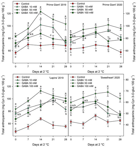 Total anthocyanin content (mg cyanidin 3-O-gluciside equivalent (Cyn 3-O-gluc) 100 g−1) in sweet cherries from control and γ-aminobutyric acid (GABA)-treated trees during 28 days of storage at 2 °C. Data are the mean ± SE of three replicates. Different letters show significant differences (at p < 0.05) among treatments for each sampling date, for each cultivar and growing cycle.