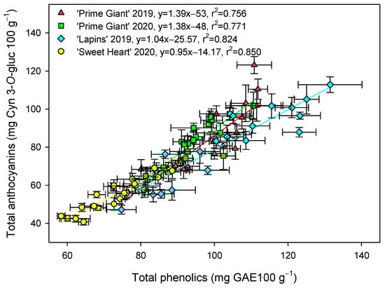 Correlation between total phenolic (mg gallic acid equivalent (GAE) 100 g−1) and anthocyanin (mg cyanidin 3-O-glucoside equivalent (Cyn 3-O-gluc) 100 g−1) concentrations for each cultivar and year taking into account data from control and treated fruit and sampling dates. Data are the mean ± SE of three replicates.