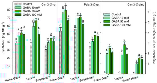 Individual anthocyanin concentration was measured at harvest (day 0, 2019 for “Prime Giant” and “Lapins” and 2020 for “Sweetheart”) and the results show that cyanidin 3-O-rutinoside (Cyn 3-O-rut) was the major one, followed by pelargonidin 3-O-rutinoside (Pelg 3-O-rut) and cyanidin 3-O-glucoside (Cyn 3-O-gluc). These three individual anthocyanins were significantly (p < 0.05) enhanced by GABA treatments in all cultivars, and in general, the highest increases were observed for the 50 mM GABA dose (Figure 6).