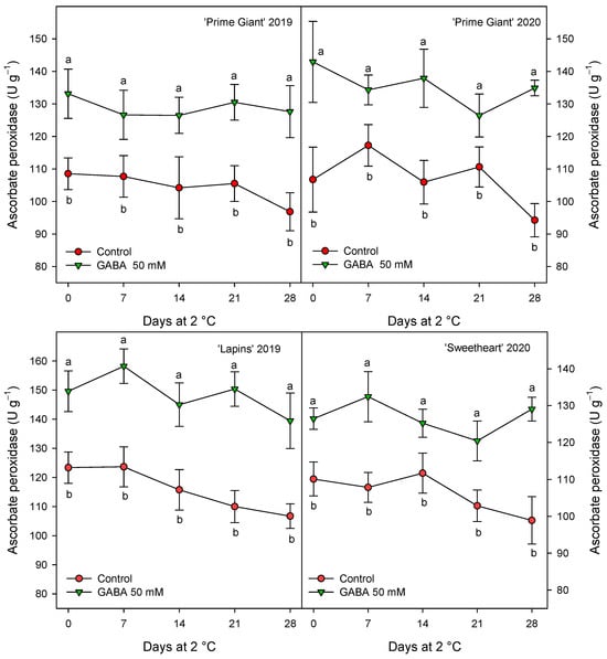 Ascorbate peroxidase activity in sweet cherries from control and γ-aminobutyric acid (GABA)-treated trees during 28 days of storage at 2 °C. Data are the mean ± SE of three replicates. Different letters show significant differences (at p < 0.05) between treatments for each sampling date, for each cultivar and growing cycle.