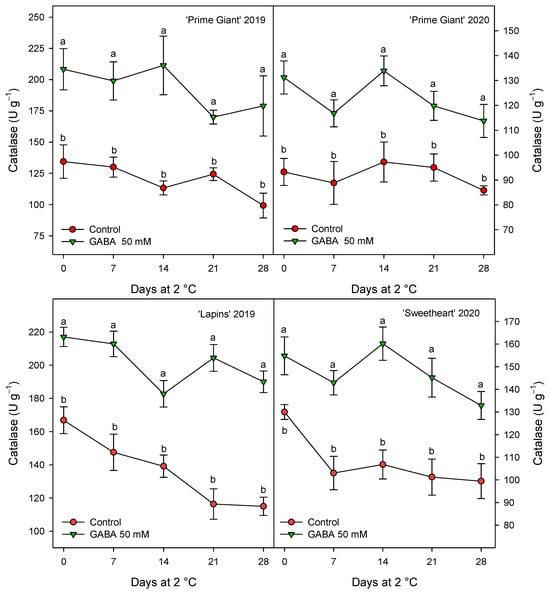 Catalase activity in sweet cherries from control and γ-aminobutyric acid (GABA)-treated trees during 28 days of storage at 2 °C. Data are the mean ± SE of three replicates. Different letters show significant differences (at p < 0.05) between treatments for each sampling date, for each cultivar and growing cycle.