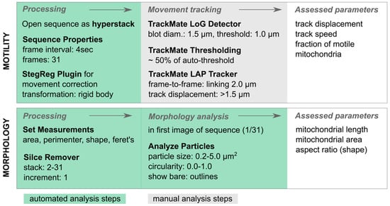 Overview of semi-automated analysis steps. Green background highlights automated steps of the semi-automated in-house developed macro, while grey identifies manual steps. The mitochondrial motility is assessed in 2 min sequences with 31 images each (1 image every 4 s) using TrackMate. For mitochondrial morphology measurements, particles are analyzed in the first image of the sequence after removal of images 2–31.