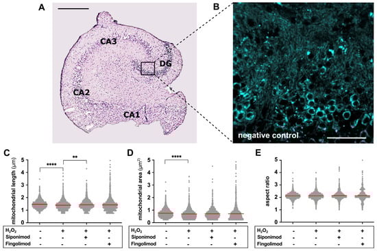 Analysis of mitochondrial area, length, and aspect ratio. (A) Exemplary H&E stained hippocampal section (brightfield microscopy) indicating the DG as the region of interest for live imaging as well as the subfields of cornu ammonis (CA1, CA2, and CA3). Scale bar: 100 µm. (B) Exemplary DG fluorescence image of the negative control condition in which morphological analysis is performed (40× Apo Water Objective). Scale bar: 50 µm. (C–E) Results of the semi-automated analysis of mitochondrial length, area, and aspect ratio comparing H2O2 (n = 16803) vs. negative control (n = 16569), H2O2 vs. H2O2 + siponimod (n = 17709), and H2O2 vs. H2O2 + fingolimod (n = 15161) using the Kruskal–Wallis test with preselected pairs of columns, followed by Dunn’s post hoc test. Red lines indicate the mean. ** implies p < 0.01 and **** implies p < 0.0001.