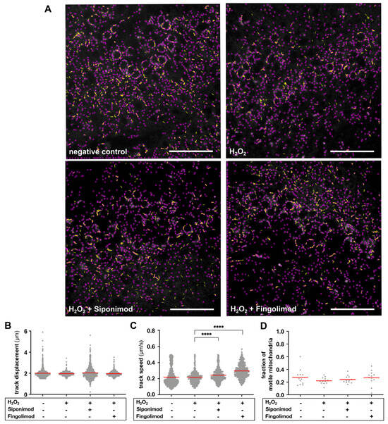 In oxidatively stressed hippocampal slices, mitochondria traveled slightly shorter distances compared to negative controls; however, this effect was not significant (Figure 3B). Upon slice treatment with H2O2, we observed no effect on mitochondrial track speed compared to negative control slices (Figure 3C). However, we observed a decrease in the fraction of motile mitochondria in H2O2-treated slices compared to negative controls (H2O2 vs. negative control, 0.220 ± 0.055 vs. 0.277 ± 0.128) (Figure 3A,D). Treatment with siponimod showed a trend to prevent the oxidative stress-induced decrease in mitochondrial displacement (Figure 3B). Moreover, siponimod treatment (H2O2 + siponimod vs. H2O2, 0.244 ± 0.081 µm/s vs. 0.219 ± 0.081 µm/s; p < 0.0001) and, in particular, fingolimod treatment (H2O2 + fingolimod vs. H2O2, 0.296 ± 0.085 µm/s vs. 0.219 ± 0.081 µm/s; p < 0.0001) led to a significant increase in track speed compared to H2O2 treatment alone (Figure 3C). Additionally, in slices treated with siponimod or fingolimod, the fractions of motile mitochondria approached that of control slices (Figure 3A,D). Due to the low sample size of computable fractions (n = 12), this effect was not significant, but H2O2 + fingolimod reached borderline significance when compared to H2O2 alone (H2O2 + fingolimod vs. H2O2, 0.269 ± 0.087 vs. 0.220 ± 0.054; p = 0.096). This effect was also observable by visual inspection, as shown in Figure 3A, while morphological changes became mainly visible through semi-automated analysis (Figure 2C,D; Figure S2 in Supplementary Materials). Table 2 provides a summary of results on mitochondrial motility.