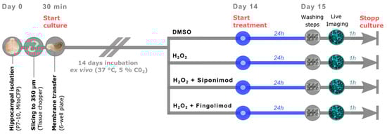 On day 14 of the organotypic hippocampal slice culture, the substance treatment was conducted at 37 °C and 5% CO2 for the duration of 24 h (Figure 4). For induction of oxidative stress, slices were incubated with 100 µM H2O2 (positive control condition; Sigma-Aldrich, St. Louis, MO, USA) [87]. The selection of this specific concentration was based on previous ex vivo studies on mitochondrial dynamics [47,48,49,88], while the time of incubation was adapted to our long-term treatment approach. To assess the ability of the S1PR modulators to antagonize the effect of H2O2 on mitochondrial dynamics, slices were treated with 100 µM H2O2 + 1 nM siponimod (BAF312; Hölzel Diagnostika Handels GmbH, Cologne, Germany) or 100 µM H2O2 + 1 nM fingolimod (FTY20; Sigma-Aldrich Chemie GmbH, Taufkirchen, Germany), respectively. To establish a negative control, slices were incubated with a DMSO-containing culture medium in a manner consistent with its use in siponimod- or fingolimod-treated slices (Figure 4). For optimal substance penetration into the hippocampal tissue, 100 μL of the respective substance-enriched medium was applied on top of the membrane inserts onto the hippocampal slices. The timing of substance application corresponded to the imaging time point of the same condition on the following day.