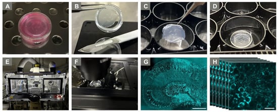 Live imaging set-up. (A) Washing of membrane in culture medium (2 × 10 min, 37 °C, 5% CO2). (B) Cutting out of membrane from culture insert. (C) Membrane transfer to glass-bottom plate with imaging medium. (D) Grid placement to prevent membrane movement. (E) Incubation chamber of the Nikon Spinning Disk Confocal CSU-X. (F) The glass-bottom plate inside the imaging chamber. (G) Exemplary CFP fluorescence image of the well-preserved hippocampal slice (stitched, 40× Apo Water Objective). Scale bar: 100 µm. (H) 2 min time-lapse acquisition (DG region, stack of 31 images, 40× Apo Water Objective). Scale bar: 20 µm.