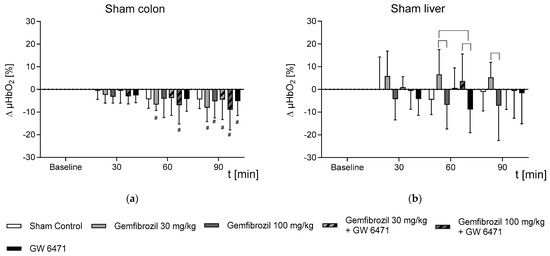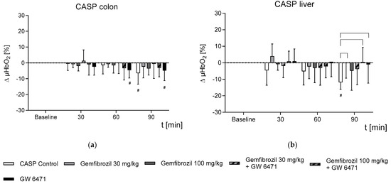 - In non-septic subjects, gemfibrozil treatment had an organ-dependent effect on microvascular oxygenation, displayed by stable µHbO2 measurements in the liver but a slight reduction in the colon.