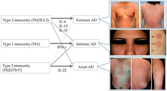 Along with type 2, the co-existence of multiple cytokine axes of type 3 and type 1 types is seen especially in intrinsic and Asian types of AD. Intrinsic AD shows similar Th2 and higher Th1 and Th17 immune activation compared to that in extrinsic AD [,]. The Asian AD phenotype combines features of AD and psoriasis with increased Th17 polarization [,,]. The frequencies of CLA+ Th1 were significantly lower in AD infants than those in older patients, but CLA+ Th2 was similarly expanded across all age groups []. Thus, a type 2 dominant inflammatory state, generally known to be an essential characteristic of AD, is seen in “extrinsic”, “European American”, and “pediatric” subtypes. Taken together, type 3 and type 1 cytokines are additionally accompanied with the type 2 axis in “Asian”, “intrinsic”, and “adult” types (Figure 1).