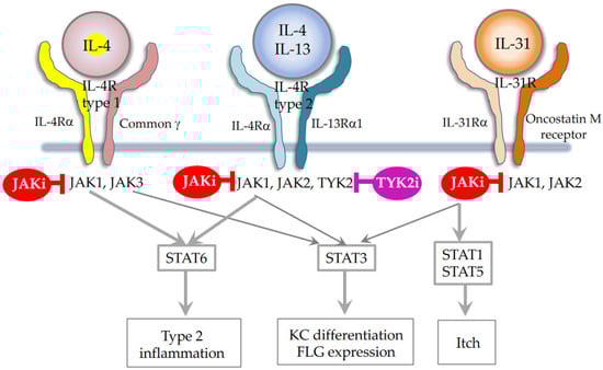 In addition to these biologics, Janus kinase (JAK) inhibitors, baricitinib [], upadacitinib [], and abrocitinib [] have recently been marketed for the treatment of AD. They mainly inhibit JAK1, which is crucial for the induction of AD [,,] (Figure 2). In fact, JAK1 gain-of-function causes AD-like skin lesions, eosinophilia, and keratinization of the epidermis [,,]. Thus, it seems that JAK1 inhibitors have a therapeutic effect on type 2 inflammation, as represented by extrinsic AD, European–American AD, and pediatric AD. However, JAK1 signaling transduces not only for type 2 cytokines, but also for IFN-α/β, IFN-γ, and IL-22 [,,] (Figure 3). Given this broad ability to inhibit type 2, type 1, and type 3 cytokines, JAK inhibitors are potentially efficacious for Th1/Th2/Th17-dominant and Th2/eosinophil-inferior endotypes. In this sense, it is anticipated that JAL inhibitors exert therapeutic effects on the broad spectrum of AD.