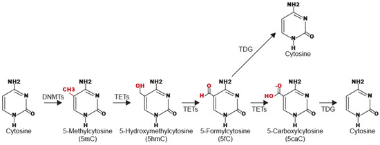 Currently, it is well known that TET enzymes participate in two processes of DNA demethylation, called active (or direct) and passive (indirect) demethylation. In the first process, TET enzymes oxidate the 5mC to 5hmC [11,16,21], which is transformed to 5-formylcytosine (5fC), and 5-carboxylcytosine (5caC) [17] (Figure 2). The 5fC and 5caC are removed by Thymine-DNA Glycosylase (TDG) enzyme and replaced by unmodified cytosines via the Base-Excision Repair (BER) pathway [22,23,24] (Figure 2).