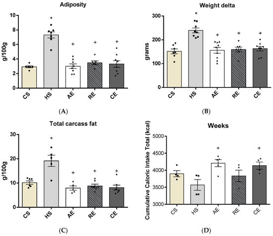 Body parameters after 16-week treatment and total food intake of CS, HS, AE, RE, and CE groups: (A) visceral adiposity (g/100 g), (B) delta weight (g), (C) total carcass fat (g/100 g body mass), and (D) cumulative caloric intake total (kcal). Samples varying from 4 to 9 animals; *: difference of CS; +: difference of HS group.
