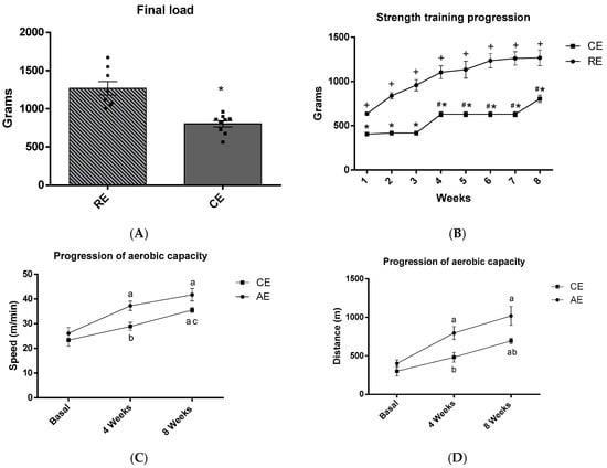 Load in grams of animals submitted to resistance or combined exercise and aerobic performance of animals submitted to aerobic or combined exercise: (A) final load (grams) of RE and CE groups, (B) strength training progression (grams) of RE and CE groups, (C) progression of aerobic capacity—speed (m/min), and (D) distance (m) of AE and CE groups during the 8 weeks of training. Samples varying from 8 to 9 animals; *: difference of RE group; #: difference of 1, 2, and 3 weeks in CE group; +: difference of 1 week; a: difference of difference of basal; b: difference of AE group; c: difference of 4 weeks.