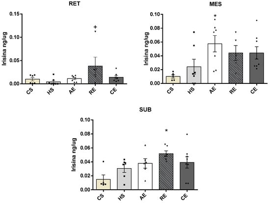 Adipose tissue irisin levels (ng/µg of total protein content) of CS, HS, AE, RE, and CE groups on adipose tissue: RET: retroperitoneal; MES: mesenteric; SUB: subcutaneous. Samples varying from 5 to 8 animals; *: significant difference of CS group; +: significant difference of HS group.
