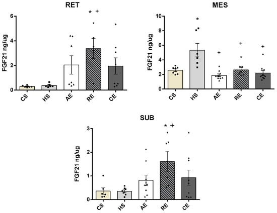 Adipose tissue FGF21 levels (ng/µg of total protein content) of CS, HS, AE, RE, and CE groups on adipose tissue: RET: retroperitoneal; MES: mesenteric; SUB: subcutaneous. Samples varying from 5 to 8 animals; *: significant difference of CS group; +: significant difference of HS group.