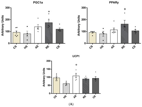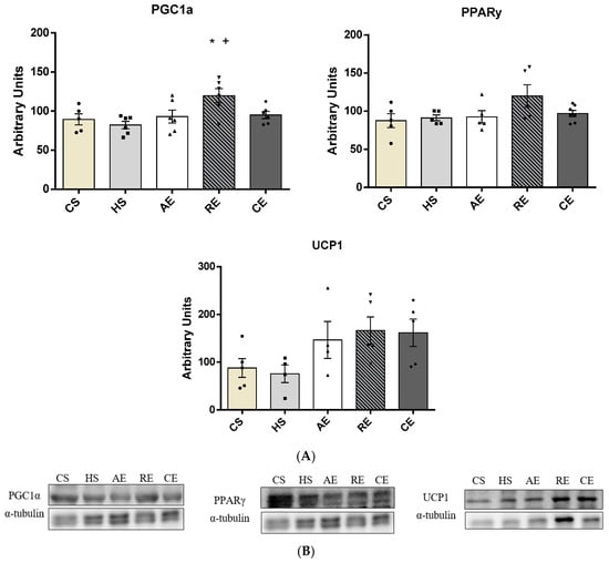 Subcutaneous adipose tissue protein content by Western blotting from PGC1α (molecular weight: 90 KDa), PPARγ (molecular weight: 53/57 KDa), and UCP1 (molecular weight: 30 KDa) of CS, HS, AE, RE, and CE groups: (A) intensity of each band of the proteins analysed and (B) respective housekeeping protein (β-actin). Samples varying from 5 to 7 animals. *: significant difference of CS group; +: significant difference of HS group.