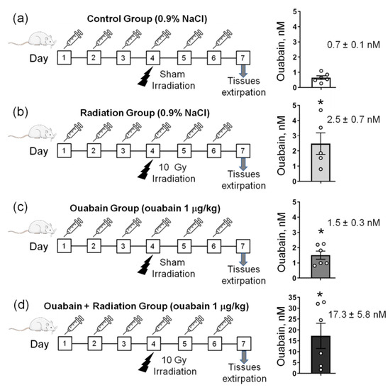 The study design is presented in Figure 1a–d. Animals (n = 26) were randomly divided into four groups: (a) ‘Control’ (n = 6)–were subjected to intraperitoneal injections of 1 mL sterile 0.9% NaCl (vehicle) for 6 days, on the fourth day were subjected to sham irradiation procedure; (b) ‘Radiation’ (n = 7)–were subjected to injections of 1 mL sterile 0.9% NaCl (vehicle) for 6 days, on the fourth day were exposed to 10-Gy total-body X-ray irradiation; (c) ‘Ouabain’ (n = 6)–were subjected to intraperitoneal injections of ouabain at a dose of 1 µg/kg for 6 days, on the fourth day were subjected to sham irradiation procedure; (d) ‘Ouabain + Radiation’ (n = 7)–were subjected to injections of ouabain at a dose of 1 μg/kg for 6 days, on the fourth day were exposed to 10-Gy total-body X-ray irradiation.