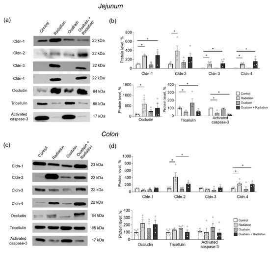 Vertical Stain FreeTM gel electrophoresis was performed to separate proteins by molecular weight. Semi-dry electrotransfer of protein content to PVDF membranes (Bio-Rad, Hercules, CA, USA) was carried out at a constant voltage of 25 V. After blocking for 2 h with 5% skimmed milk at room temperature, PVDF membranes were incubated overnight at 4 °C with 2.5% skimmed milk and either primary mouse antibody (against claudin-2 and occludin, #32-5600, #33-1500, Thermo Fisher Scientific, Waltham, MA, USA) or primary rabbit antibody (against claudin-1, -3, -4, tricellulin, #71-7800, #34-1700, #36-45800, #48-8400, Thermo Fisher Scientific, Waltham, MA, USA; against activated caspase-3, #9661s, CellSignaling, MA, USA). The next day, after intensive washing, the membranes were incubated for 45 min with 2.5% skimmed milk and horseradish-peroxidase-conjugated anti-mouse (#AB205719, Abcam, Eugene, OR, USA) or anti-rabbit secondary antibody (#a3273, Abcam, Eugene, OR, USA). Detection of the chemiluminescent signal was carried out on a Chemi-Doc XRS+ image analyzer (Bio-Rad, Hercules, CA, USA). Target band signal densities were normalized to total protein. The level of protein in the control group of animals was considered as 100%, and the values in other groups were calculated relatively to control. In the absence of a signal from the corresponding proteins, the densitometry signal was considered as zero. Due to the lack of signal for claudin-3 and -4 in the small intestine, the signal density in the ‘Radiation’ group was taken as 100%.