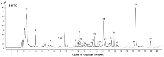 Subsequently, the analysis and identification of the compounds of the extract were carried out by HPLC-ESI-QTOF-MS/MS at a concentration of 1 mg/mL. The total ion chromatogram (TIC) obtained by analyzing the extract is shown in Figure 1. Thirty-six isolated chemical compounds were identified and quantified (Table 2). Deoxy-fructofuranosyl deoxy-glucopyranoside/fructofuranosyl dideoxy-xylo-hexopyranoside, patulitrin, methoxyquercetin, and isorhamnetin hexoside exhibited concentrations higher than 20 mg/mL.