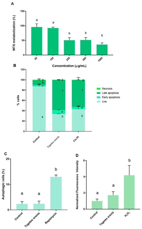 Effect of 48 h exposition of ethanolic T. erecta extract. (A) Viability assay (MTS); (B) Apoptosis/necrosis measured by flow cytometry. IC50 of cis-Pt used as positive control; (C) ROS production. H2O2 25 µM used as positive control; (D) Autophagy induction. Rapamycin 0.5 µmol L−1 as positive control. Results are expressed as mean ± SD. For each parameter, different letters indicate statistically significant differences between groups (p < 0.05).