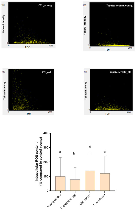 Intracellular ROS content in Young and Old worms. Intracellular ROS content was measured by the 2′,7′-dichlorofluorescein diacetate (H2DCFDA) assay. L3 stage synchronized N2 nematodes were treated or untreated with 100 µg/mL T. erecta extract and incubated at 20 °C until the read-out point of the experiment (Young worms: 5 days old; Old worms: 12 days old). Representative images of Cell ROS quantification by Multi-Range Large Particle Flow Cytometer Biosorter (Union Biometrica, MA, USA) are shown above the bar charts (yellow fluorescence intensity vs. TOF: time of flight; worm size). Data are expressed as mean ± SD of three independent experiments (n = 3). Lower-case letters, when different, indicate statistically significant differences (p < 0.05). CTL_young: Young control (untreated worms); T. erecta_young: T. erecta treated worms (Young); CTL_old: Old control (untreated worms); T. erecta_old: T. erecta treated worms (Old).