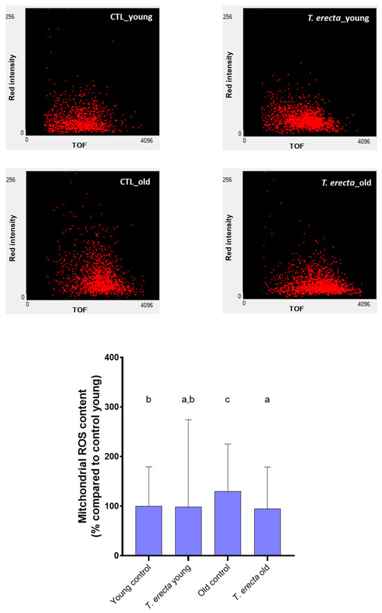 Mitochondrial ROS content in Young and Old worms. Mitochondrial ROS content was measured by the Mitotracker Red CM-H2 XRos assay. L3 stage synchronized N2 nematodes were treated or untreated with 100 µg/mL T. erecta extract and incubated at 20 °C until the read-out point of the experiment (Young worms: 5 days old; Old worms: 12 days old). Representative images of Mitochondrial ROS quantification by Multi-Range Large Particle Flow Cytometer Biosorter (Union Biometrica, MA, USA) are shown above the bar charts (red fluorescence intensity vs. TOF: time of flight; worm size). Data are expressed as mean ± SD of three independent experiments (n = 3). Lower-case letters, when different, indicate statistically significant differences (p < 0.05). CTL_young: Young control (untreated worms); T. erecta_young: T. erecta treated worms (Young); CTL_old: Old control (untreated worms); T. erecta_old: T. erecta treated worms (Old).