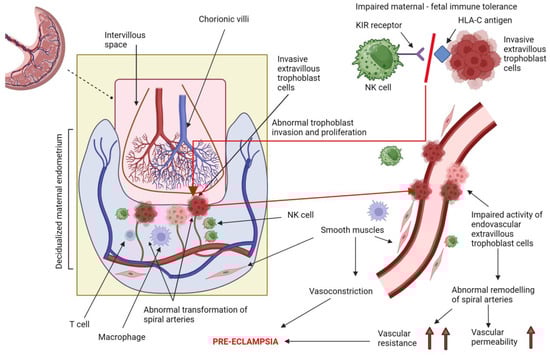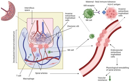 The physiological process of spiral artery remodeling is complicated and involves different interactions among maternal uterine immune cells and embryonic cells, particularly trophoblasts [,]. The maternal cells involved in this process mainly include decidual natural killer (NK) cells, T cells and macrophages [,]. The interactions between extravillous trophoblast (EVT) human leukocyte antigens (HLA) and both NK and T cells appear to be crucial in promoting maternal–fetal immune tolerance and facilitating the proper process of placentation, including trophoblast invasion into spiral arteries [,,,]. In this unique maternal–fetal “dialog”, the appropriate recognition of trophoblast human leukocyte antigen-C (HLA-C) by NK cells expressing killer cell immunoglobulin-like receptor (KIR) seems to be especially important [,,].