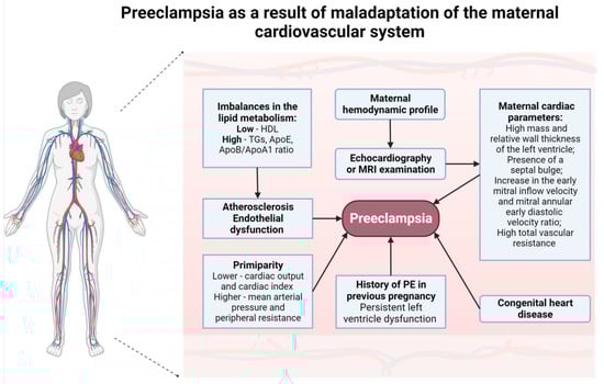 Pre-eclampsia as a result of maladaptation of the maternal cardiovascular system. Abbreviations: ApoA1—apolipoprotein A1, ApoB—apolipoprotein B, ApoE—apolipoprotein E, HDL—high-density lipoprotein, MRI—magnetic resonance imaging, PE—pre-eclampsia, TGs—triglycerides. Own authorship, created with Biorender.com (accessed on 18 December 2023).