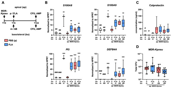 Flagellin augments the expression of antimicrobial proteins by MDR-Kpneu-infected HBE cells but does not affect bacterial outgrowth. Human bronchial epithelial (HBE) cells were infected on the apical (ap) side with 1000 colony-forming units (CFUs) of multi-drug-resistant (MDR) Klebsiella pneumoniae (Kpneu) and treated 6 h later with 50 μg/mL meropenem (AB) or medium (m) in the basolateral (ba) medium and 0.1 μg flagellin (FLA; blue) or phosphate-buffered saline (PBS; red) (p) on the apical side; samples were collected 24 h after infection (A). mRNA levels of β-defensin 4a (DEFB4A), peptidase inhibitor 3 (PI3), and calprotectin (S100A8 and S100A9) relative to the housekeeping gene HPRT in HBE cells (B). Protein levels of calprotectin (S100A8/A9 heterodimer) in the apical wash (C). CFU counts of MDR-Kpneu in the apical wash (D). Data are shown as box and whiskers representing 3 repeated experiments with n = 4 per group. # indicates significant differences as compared to FLA alone; * indicates significant differences as compared to MDR-Kpneu + medium treated cells. */# p < 0.05, **/## p < 0.01, ***/### p < 0.001.