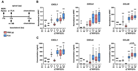 Flagellin augments the secretion of chemokines during MDR-Kpneu infection in the absence of meropenem treatment. HBE cells were infected with MDR-Kpneu on the apical (ap) side and treated at t = 6 h with meropenem (AB) or medium (m) in the basolateral (ba) medium and flagellin (FLA; blue) or PBS (p; red) on the apical side; samples were collected 24 h after infection (A). Expression levels of CXCL1, CXCL8, and CCL20 normalized to HPRT in HBE cells (B). Protein levels of CXCL1, CXCL8, and CCL20 in basolateral (ba) medium (C). Data are shown as box and whiskers representing 3 repeated experiments with n = 4 per group. # indicates significant differences as compared to FLA alone; * indicates significant differences as compared to MDR-Kpneu + medium treated cells. */# p < 0.05, **/## p < 0.01, ***/### p < 0.001.