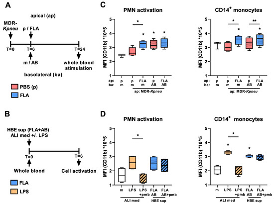 Flagellin treatment of MDR-Kpneu-infected HBE cells augments the secretion of inflammatory mediators that activate PMNs and CD14+ monocytes in whole blood. HBE cells were infected with MDR-Kpneu on the apical (ap) side and treated at t = 6 h with meropenem (AB) or medium (m) basolaterally and flagellin (FLA; blue) or PBS (p; red) apically; basolateral supernatants were collected 24 h after infection (A). Supernatants of HBE cells or ALI medium, supplemented with 10 ng/mL lipopolysaccharide (LPS; orange) or not, were incubated with whole blood for 6 h after which PMN (CD66b+) and CD14+ monocyte activation (mean fluorescence intensity (MFI) of CD11b) was determined by flow cytometry (B). Gating strategy is shown in Figure S4. Activation of PMNs and CD14+ monocytes by supernatant of MDR-Kpneu-infected HBE cells after different treatments as described in A (C). Activation of PMNs and CD14+ monocytes by ALI medium supplemented with LPS with and without 5 μg/mL polymyxin B (pmb) or supernatant of MDR-Kpneu-infected HBE cells treated with meropenem and flagellin with and without polymyxin B (D). Data are shown as box and whiskers representing data from 2–4 healthy blood donors with 4 technical replicates per group derived from pooled supernatants. * Indicates significant differences as compared to medium-treated controls or between the indicated groups. * p < 0.05, ** p < 0.01.