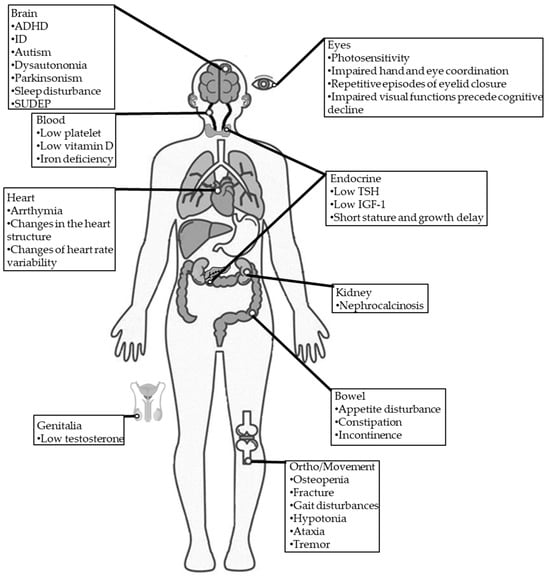 DS is often associated with various comorbidities, such as blood, cardiac, digestive, endocrine, infection, neurodegenerative, orthopedic, and sleep impairments (Figure 1) [13].