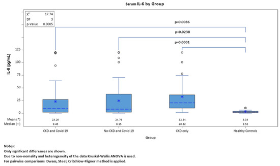 Since the beginning of the COVID-19 pandemic there have been many studies that aimed to improve the prognosis for the clinical course of the disease. Several biochemical parameters were selected and assessed as possible predictors of disease severity. The elevated levels of IL-6, D-dimers, CRP, neutrophils, and a low lymphocyte count have been associated with severe forms of COVID-19 [16,17]. In this prospective study including COVID-19 patients with or without CKD at baseline, we assessed the incremental values of the blood biomarkers (IL-6 and SAA) and evaluated them at hospitalization to identify if they could predict fatal outcome and AKI. Both serum IL-6 and SAA levels were linked to mortality and AKI. A recent systematic review showed that IL-6 significantly increases the risk of COVID-19 with a greater severity of disease (adjusted OR = 1.0284; 95% CI 1.0130–1.0441; p = 0.0003) and likelihood of mortality (adjusted OR = 1.0076; 95% CI 1.0004–1.0148; p = 0.04; adjusted hazard ratio (aHR) = 1.0036; 95% CI 1.0010–1.0061; p = 0.006) [18]. Another systematic review of 147 studies showed that COVID-19 patients who eventually died had 42.1-fold higher mean IL-6 concentrations than patients who survived. IL-6 levels were also elevated significantly in those who were deceased (MD: 42.11; p < 0.001; 95% CI: 36.86,47.36) [19].